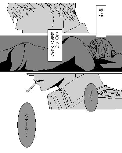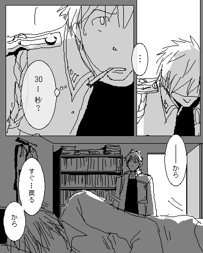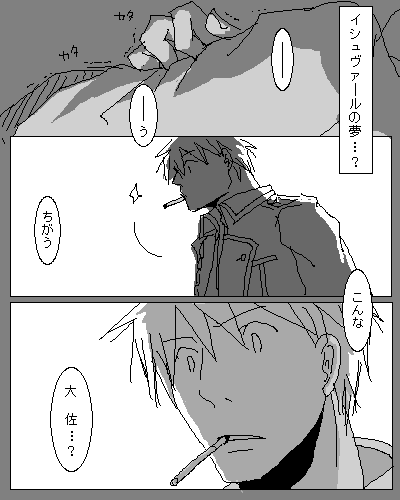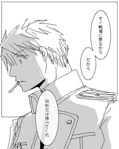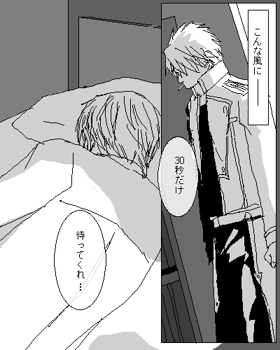 ハボのそのぱんつはきっと大佐が買ってきたんでしょうね。穿かなきゃ部屋に入れないとか言われたらはかざるを得ない…!司令部のシャワー室でせいぜい恥かきゃいいんですよ(ハボに対しての管理人のこの態度)