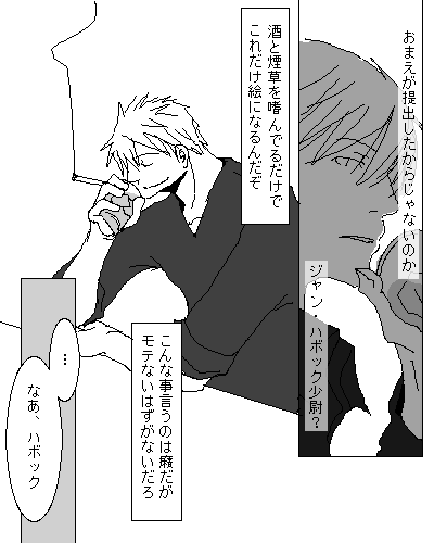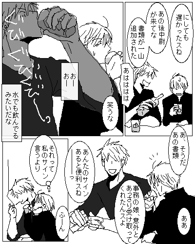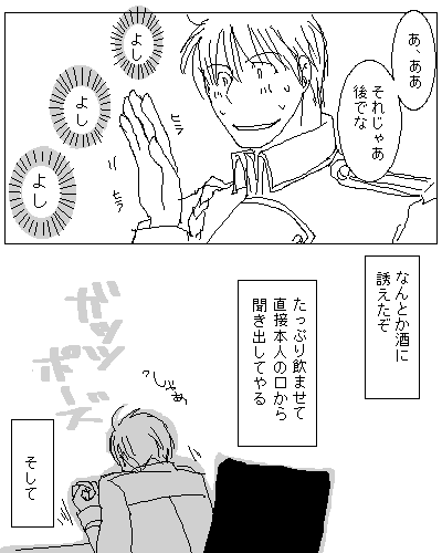 原作読破お疲れ様です。やっぱり仕事中にいちゃいちゃできないですからね。大佐は仕事が終わったらハボに優しくしてると思います。そういうのを妄想すると楽しい…(笑)