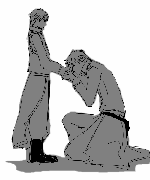 そんなこんなで2話まで一気に視聴させて貰いました。いや、萌えた。特に黒髪王子(ネーミングは適当です)の方が持ってる刀(和装とか日本刀とか出てくる不思議な設定)に金髪騎士がキスするシーンが好きで、ちょっとハボロイ仕様で描いてみました。忠誠を誓うキスっていいよねって話。